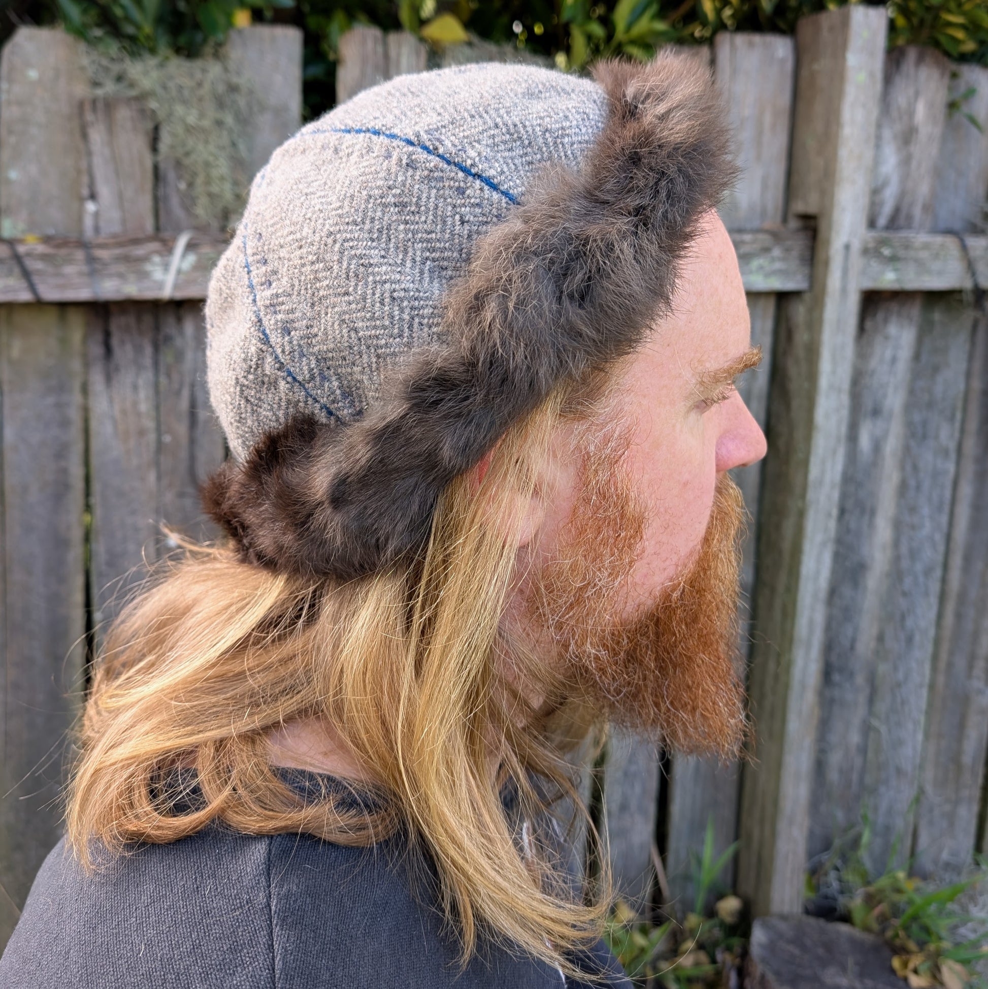 Hand-Embroidered Grey Herringbone Wool Linen and Rabbit Fur Viking Hat