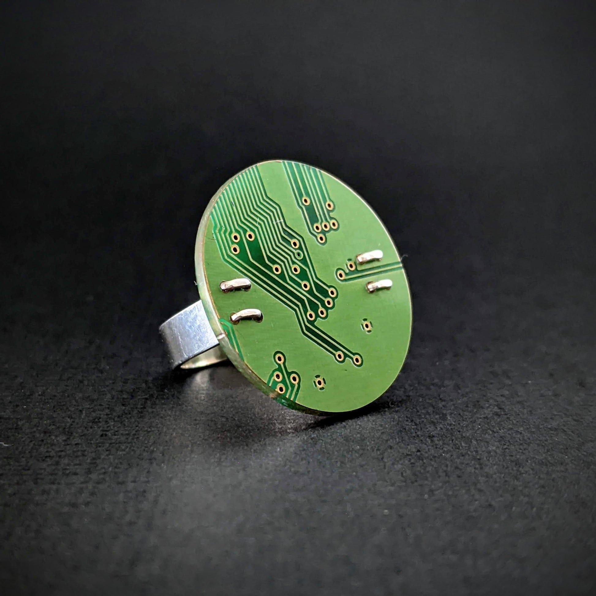 Each disc is hand cut from a random piece of circuit board, making every ring unique.